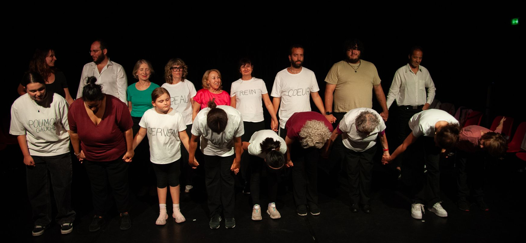 Ensemble, sous la direction de Marion Bégoc et Mathilde Evano, nous co-construisons une pièce de théâtre sur le thème du corps avec un groupe d'environ 15 personnes. Le plus jeune, Luca, a 8 ans et la doyenne Paulette a 92 ans.